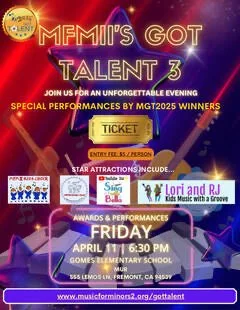 Students from grades TK to Grade 5 sent in their videos of them singing, dancing and playing instruments - individual and group. Select contestants were invited to perform at the annual MFMII Got Talent Concert and Awards Ceremony on Friday, April 11, 2025, at 6.30 PM, at John Gomes Elementary School, Fremont. What a show!